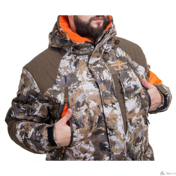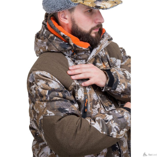 Теплый костюм для зимней охоты. Надежно защищает от осадков, ветра и холода. Обладает паропроницаемостью материала и принудительной вентиляцией через отверстия-карманы. Отличается удобным анатомическим кроем, не стесняющим движений. Укомплектован шапкой-шарфом-маской и сигнальной повязкой на рукав. Наиболее истираемые места защищены самым прочным материалом – кевларом, что делает изделие «неубиваемым». Большое количество недоступных для влаги карманов, «тихие» магнитные застежки вместо ленты Velcro и съемные наколенники 3D формы доставят массу положительных ощущений обладателю этого изделия.